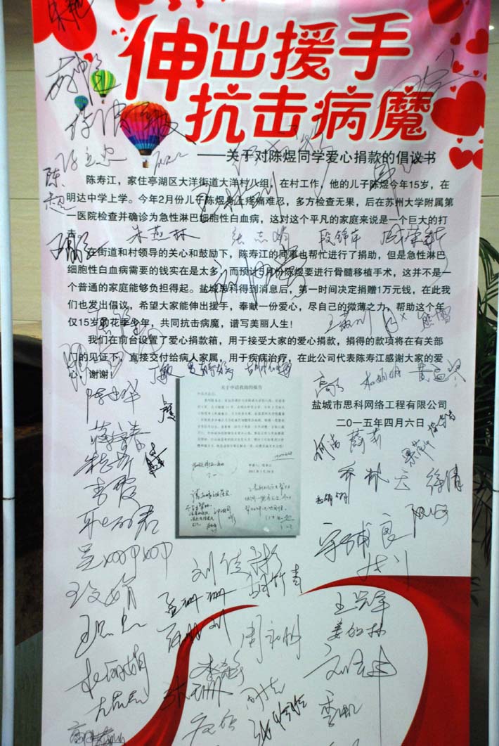 4月7日,在公司領導的關心和倡議下,鹽城思科全體員工發(fā)起了為陳煜同學愛心捐款的活動,大家都主動從自己的工資里拿出一百、五十、二十、十元……盡自己的微薄之力為陳煜同學獻上一份愛心,助其抗擊病魔,走出困境。
